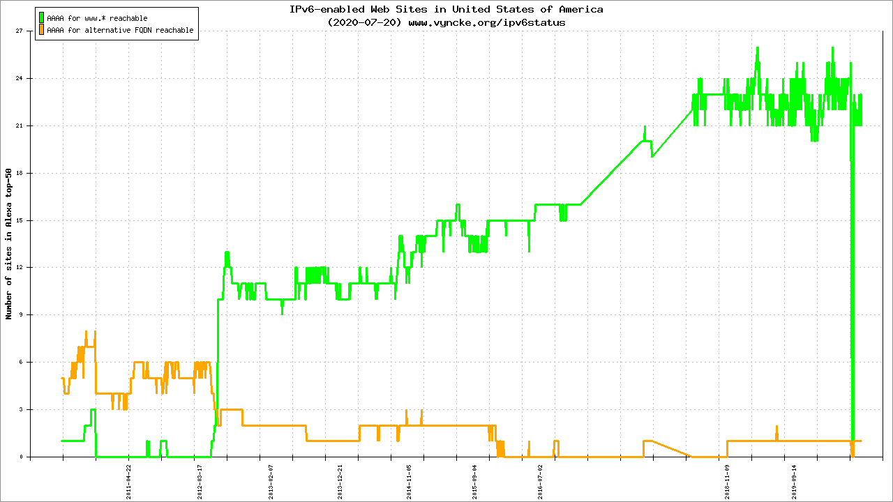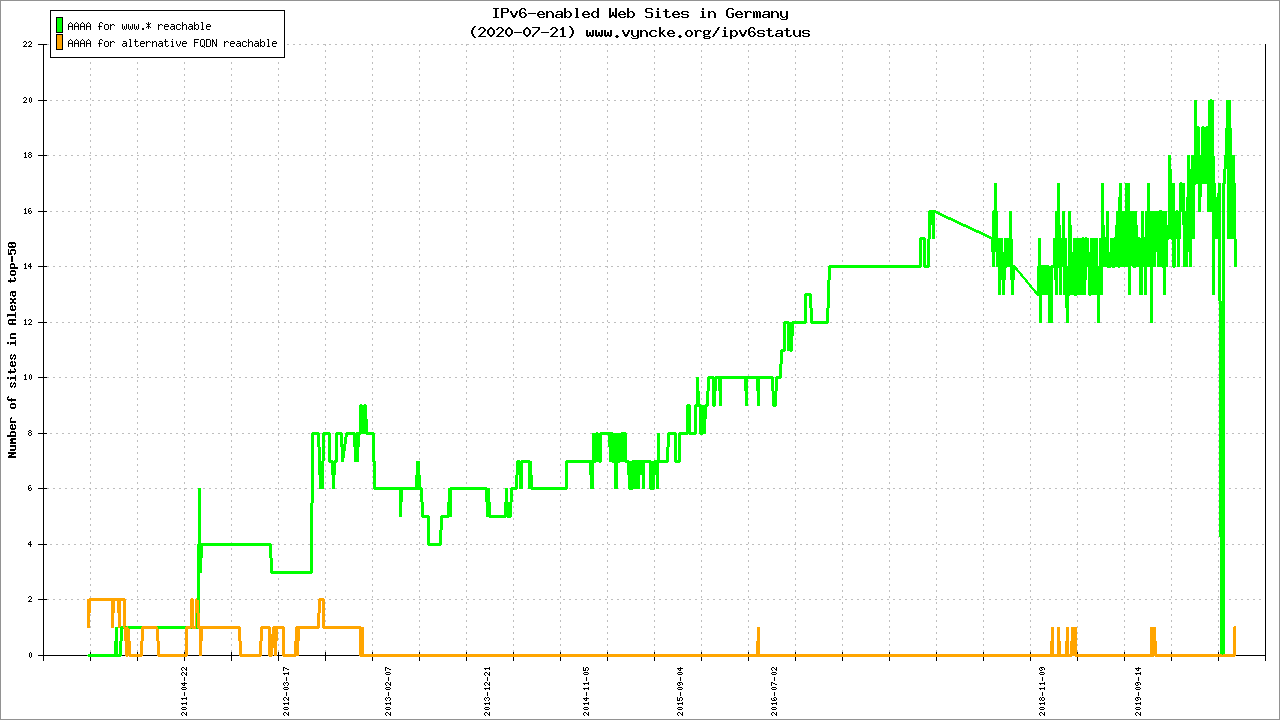 德國從2012年中期到2015年底支持IPv6的網站數量一直在10個以下。從2016年7月開始有了明顯的上升,至今維持在了16個左右,最高時達到了20個(圖4)。