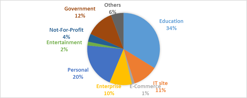 據全球IPv6論壇IPv6 Enabled WWW Logo認證項目統計,截止到2020年6月,全球已有2697個網站通過IPv6 Enabled WWW Logo測試并獲得認證。以下是IPv6 Enabled WWW Logo項目提供的累年總體統計數據,如圖9。IPv6 Enabled認證的網站按國家/地區分布統計如圖10,IPv6 Enabled Logo按網站類型統計如圖11。