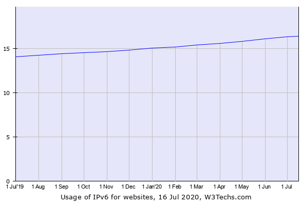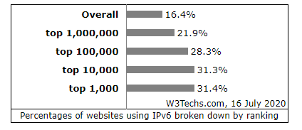 根據W3Techs的數據顯示,截止到2020年7月16日,全球所有網站中有16.4%的網站支持IPv6訪問,比去年提高了1.8%。排名前100萬的網站中有21.9%的網站支持IPv6訪問,比去年提高了2.7%。排名前10000的網站IPv6支持率31.3%,比去年提高了3.6%(圖1~圖2)。
