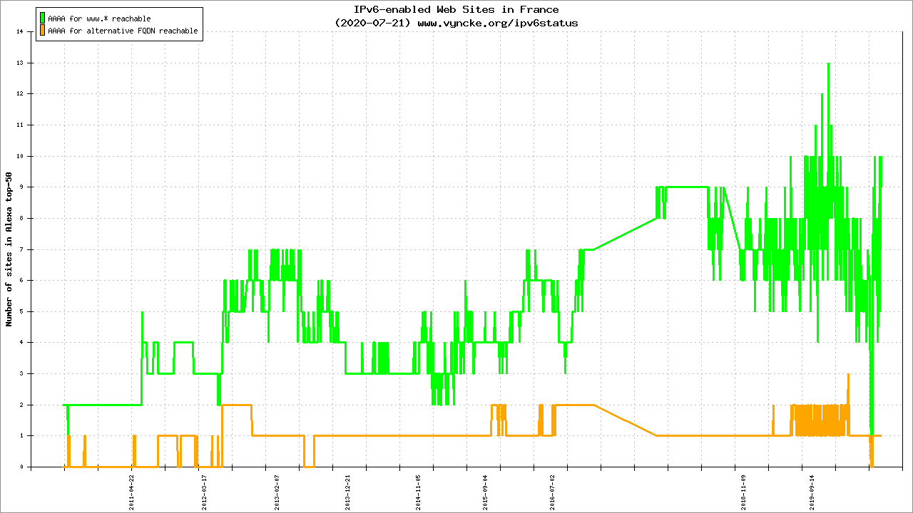 法國方面,從2011年開始至今,Top50的網站中支持IPv6網站數量幾乎沒有超過10過,大部分時期都是在10個以下,平均保持在6個左右,最高時達到了13個(圖5)。