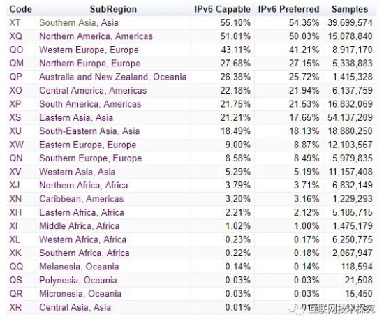 表1分別統計列舉了各大洲一些代表國家或地區IPv6部署情況,歐洲,美洲,亞洲,大洋洲等區域一些代表性國家和地區IPv6部署總體都超過了40%,非洲國家IPv6部署率整體比較落后。