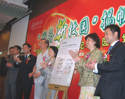 國家發(fā)改委、教育部、清華大學的領(lǐng)導與賽爾網(wǎng)絡(luò)董事長梁猷能先生、合作廠商、銀行代表共同啟動“網(wǎng)絡(luò)新校園”計劃