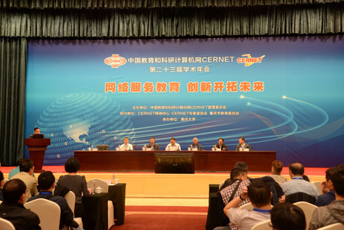 2016年10月25日,中國教育和科研計算機網CERNET第二十三屆學術年會暨會員代表大會在重慶開幕。本次大會以"乘'互聯網+'的浪潮,推進教育信息化的創新"為主題,中國工程院院士、重慶大學校長周緒紅,教育部科技司司長王延覺,中央網信辦網絡安全協調局副局長胡嘯,中國工程院院士、CERNET專家委員會主任吳建平,華中師范大學校長楊宗凱,重慶市教委副主任鄧睿,北京理工大學常務副校長楊賓,中國農業大學副校長王濤,天津大學副校長劉東志,華中科技大學副校長梁茜,華南理工大學副校長彭說龍,電子科技大學副校長胡皓全,北京大學校長助理程旭,青海大學黨委常委、校長助理王曉英等以及來自全國各省市教育廳局、CERNET高校會員單位代表、廠商代表1200余人參會,開幕式由重慶大學副校長李茂國主持。