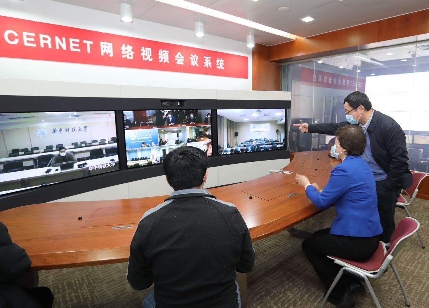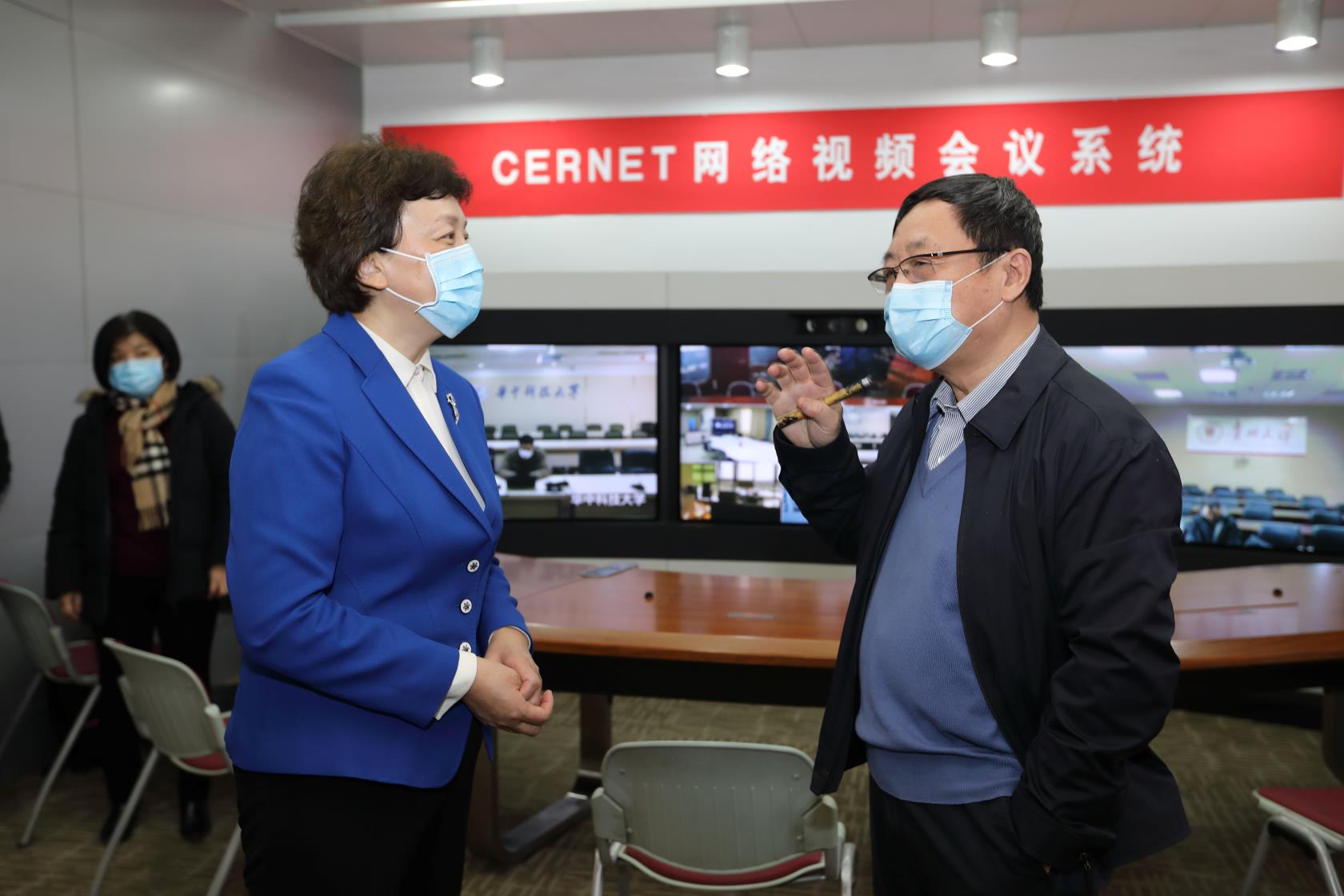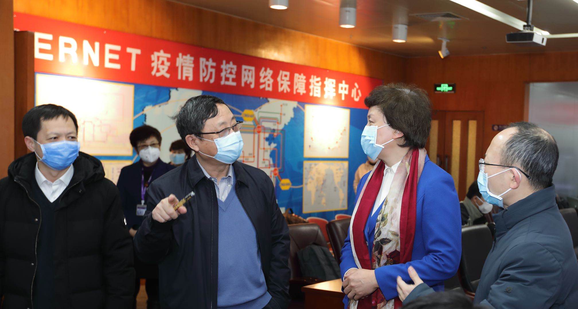 在中國教育和科研計算機網CERNET疫情防控網絡保障指揮中心,陳旭聽取了CERNET網絡中心主任、清華大學網絡研究院院長吳建平院士關于清華大學牽頭建設和運行管理的CERNET網絡中心為全國教育系統的疫情防控工作提供高速、穩定、安全、可靠的網絡服務和教學科研信息化保障情況。