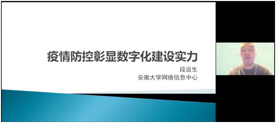 安徽大學網絡信息中心副主任段運生,就如何利用學校信息化建設,彰顯疫情防控數字化建設實力進行分享,并引出人員基礎數據整理,各類線上資源準備及應用架構的穩定性和可擴張性的思考。