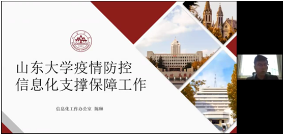 山東大學信息化工作辦公室網絡與技術服務中心副主任陳琳,通過線上教學,連通校內校外,掌上會議與辦公,疫情防控信息,創新信息化服務,加強防控宣傳,日常風險防控幾個方面,分享了山東大學疫情防控信息化支撐保障工作。