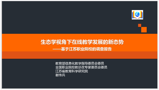 江蘇省教育科學研究院職業教育與終身教育研究主任謝傳兵,做了《生態學視角下在線教學發展的新態勢——基于江蘇職業院校的調查報告》,從生態視角對在線教育發展、基于江蘇的在線教學調查做了分析。指出全省職業院校在歷史上第一次真正實現了超大規模的“停課不停學”,逐步克服基本條件和基礎能力不足等重重困難,以史無前例的在線教學實際行動,最大限度阻斷疫情傳播擴散渠道,為全省職業院校師生的身心健康和保障教學質量樹起了堅強的基石。在線教學的全面推進,遠不僅僅是疫情防控的一時之需,更是江蘇職業教育未來深化職業教育信息化教學、全面推進教學改革和創新的新常態。