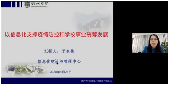 滁州學院信息化建設與管理中心主任于春燕,介紹了滁州學院疫情期間如何統籌支撐“防控”和“發展”。她說,信息化對學校的支撐作用日益重要,功夫在平時;疫情防控與智慧校園要兩手抓,互相促進;培養一支能打硬仗的信息化隊伍。