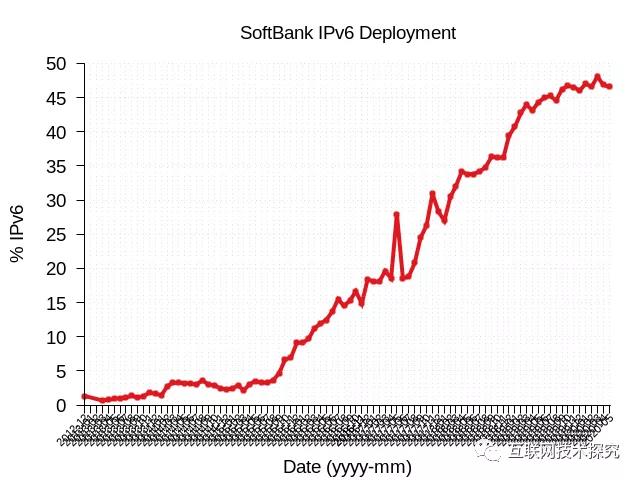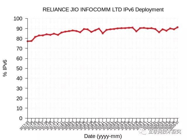 在亞洲方面,日本運營商SoftBank在五年內就將IPv6部署率從4%提升到了46%(圖7)。印度的電信運營商Reliance Jio則在短短幾年內就增長到了90%(圖8)。