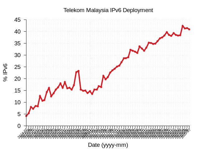 從圖15的曲線圖中以看出,3BB IPv6部署率在三年多的時間內實現了從0到64%的突破。Telekom Malaysia是馬來西亞唯一的電信公司,目前IPv6的部署率接近45%(圖16)。