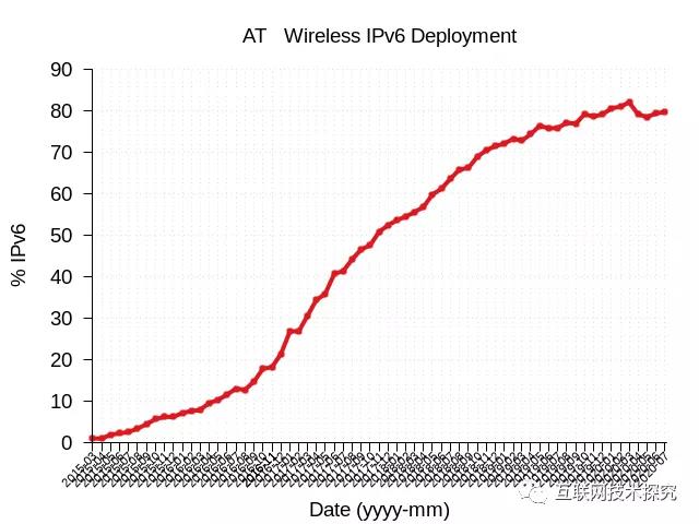 因此,他們的IPv6流量增加顯著,超過65%的用戶使用IPv6(圖9)。美國運營商AT&T的IPv6部署率達到了80%(圖10)。
