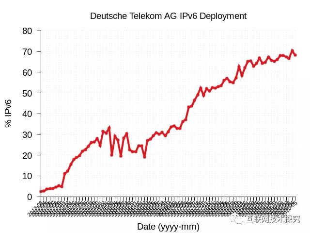 歐洲方面,Cosmote是希臘最大的移動運營商,用戶達到了790萬,圖5顯示它在2016年開始啟用IPv6,在4年內將IPv6部署率提升到了80%。德國電信運營商Deutsche Telekom AG,在7年時間內將IPv6部署率提升到了70%(圖6)。