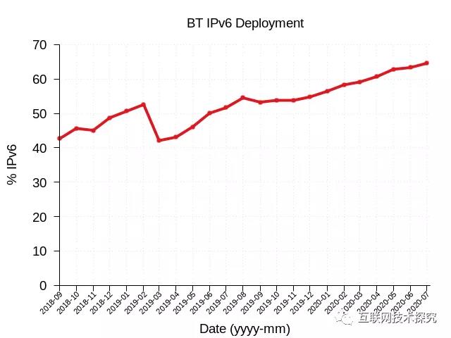 在歐洲方面,Nethys(VOO)是比利時當地的有線電視運營商,圖12顯示,VOO從2013年就開始支持IPv6,并在2020年將IPv6部署率提升到了80%。BT-British Telecom是英國最大的電信運營商,英國所有的電話線都是要通過他們進行開通。